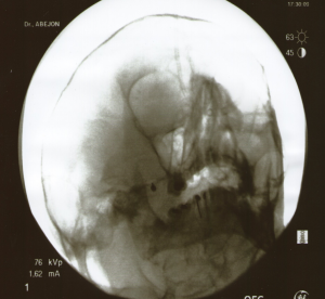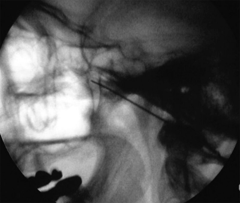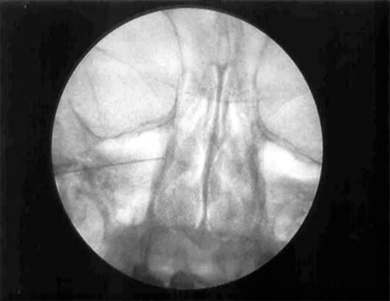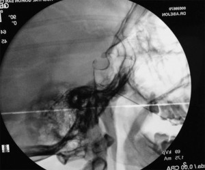 El paciente se coloca en decúbito supino. Con una proyección lateral del arco de rayos se localiza el angulo mandibular, de manera que podamos obtener una proyección lateral pura, se elimina el doble contorno mandibular, una vez conseguida esta proyección también se elimina la posibilidad de visualizar dos fosas en la proyección. En este momento se procede a fijar la cabeza del enfermo a la mesa quirúrgica. Con la proyección lateral se localiza la fosa pterigopalatina del lado a tratar En esta proyección se deben localizar la silla turca, el clivus y el seno esfenoidal. La fosa pterigoideapalatina se encuentra en la parte anteroinferior del seno esfenoidal, teniendo una forma de coma, situándose el ganglio en el tercio superior de la misma. Una vez localizada la imagen radiológica, se sitúa una varilla metálica que se superponga longitudinalmente con la fosa y se marca una línea en la piel que coincida con la barra. En el punto donde esta línea se cruza con el borde inferior del arco zigomático tendremos el punto de entrada. Se llega a la fosa a través de la escotadura mandibular y la fisura pterigomaxilar. Esta técnica no se puede realizar en visión túnel, pues se interpone el arco zigomático, por lo que tendremos que dirigir la aguja ligeramente superior y anterior, hasta que choquemos con hueso. A continuación recolocamos los rayos en visión anteroposterior comprobando la situación final de la aguja por dentro del borde de la fosa nasal, por encima del cornete medio.