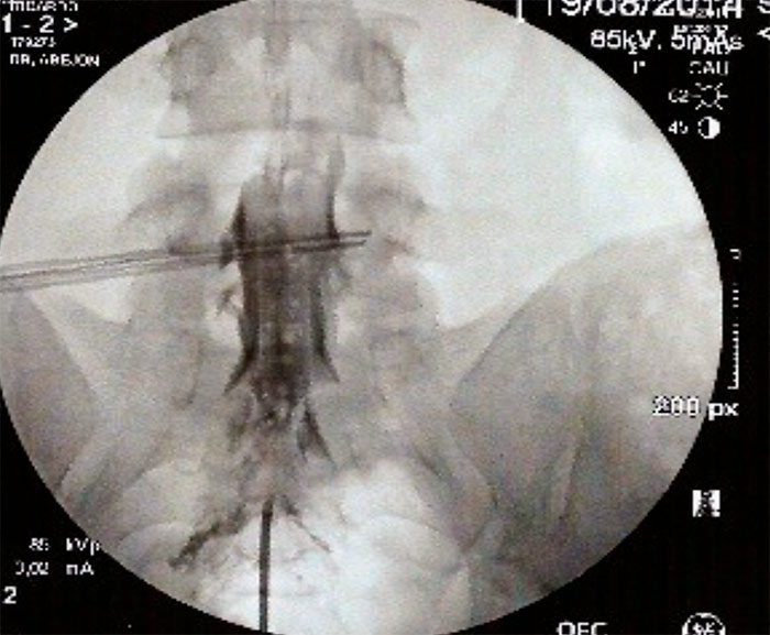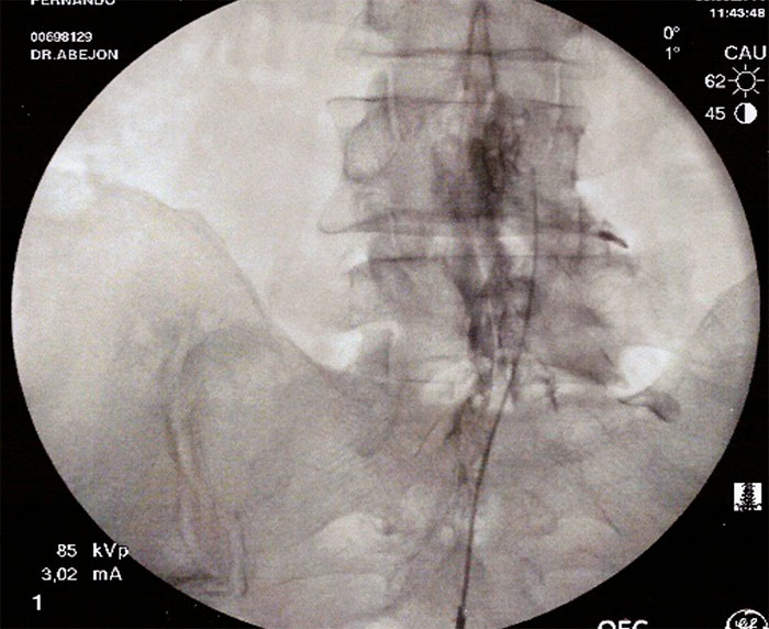 A continuación se introduce un catéter y se dirige hacia la zona de amputación radiológica, en el espacio epidural anterior. Con el arco de rayos en posición lateral, se inyectan 10ml de suero salino 0.9% con 1500v de hialuronidasa en la zona de amputación, posteriormente se inyecta de 3-5ml de contraste radiológico para visualizar la apertura del espacio, y a continuación se inyecta 9ml de Bupivacaina 0.25% y 40mg de triamcinolona. Se retira la aguja introductora y el catéter y se coloca un apósito. Hay autores que dejan el catéter durante 3 días y vuelven a inyectar el anestésico local y suero salino fisiológico al 10% (está en discusión). Con el catéter de RCE Cosman, se dirige a la zona amputada de contraste, se sigue el procedimiento anterior y además se intenta dirigir la punta del catéter debajo del pedículo que es donde se encontraría el ganglio de la raíz dorsal y se procede a hacer radiofrecuencia pulsada (estimulo sensitivo alrededor de 0.5v y el 45v, por un periodo de 2 a 8 minutos.